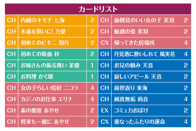 ※「内緒のキモチ 七海」「魅惑の姿 美羽」「寂しいアピール 天音」はトライアルデッキ限定カードです。